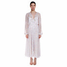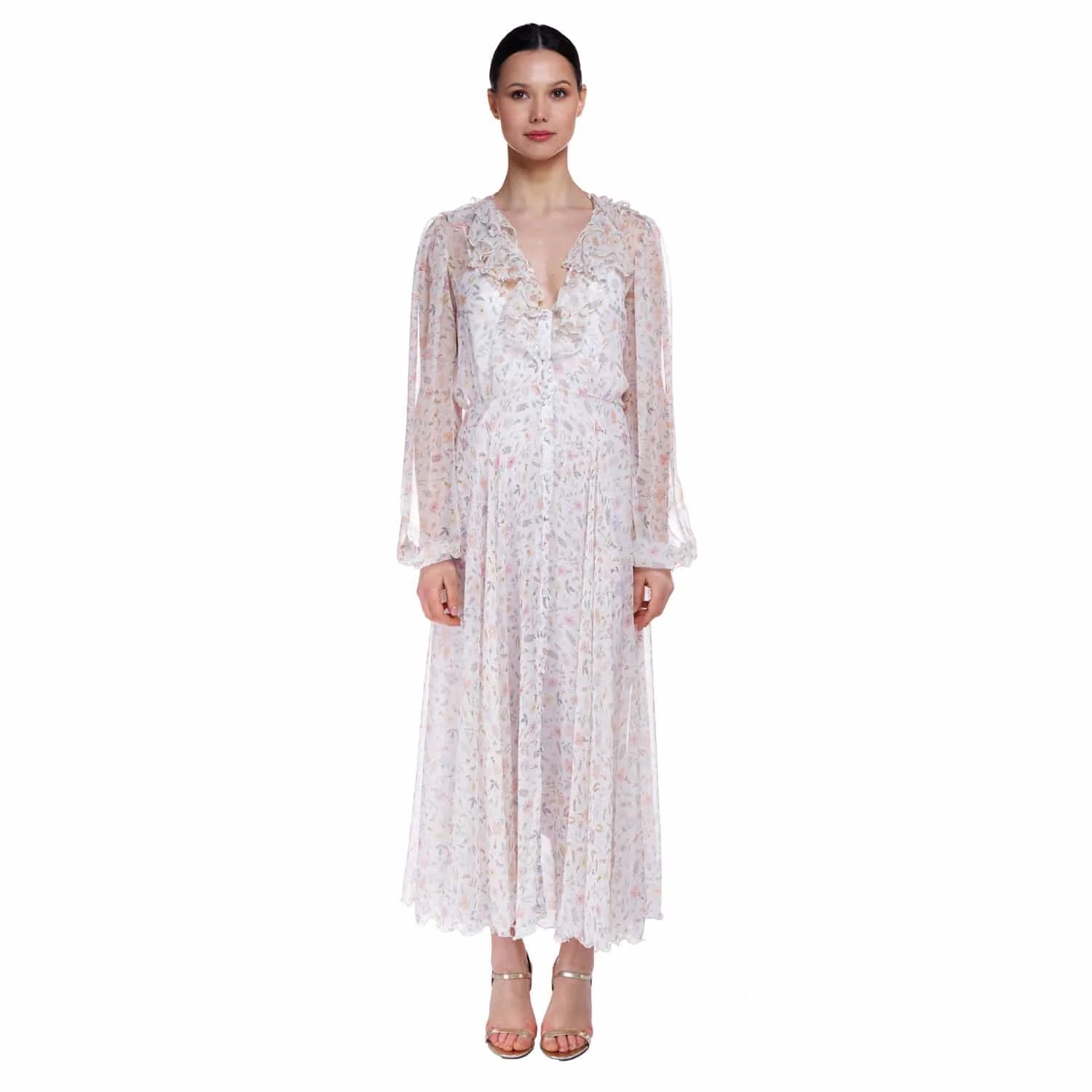 Elegant long dress in silk georgette with the “white angel” floral pattern of Sofia Tsereteli. Wide sleeve curled at the shoulder and on the bottom closed by a cuff with its hand-covered button. V-neckline accompanied by an internal rouge on the front. Central buttoning with buttons covered with the same fabric as the dress. Full-wheel skirt that moves creating waves that enhance the pattern of the fabric. Behind the transparency you can see the petticoat with soft and very feminine lines and a breast cut.