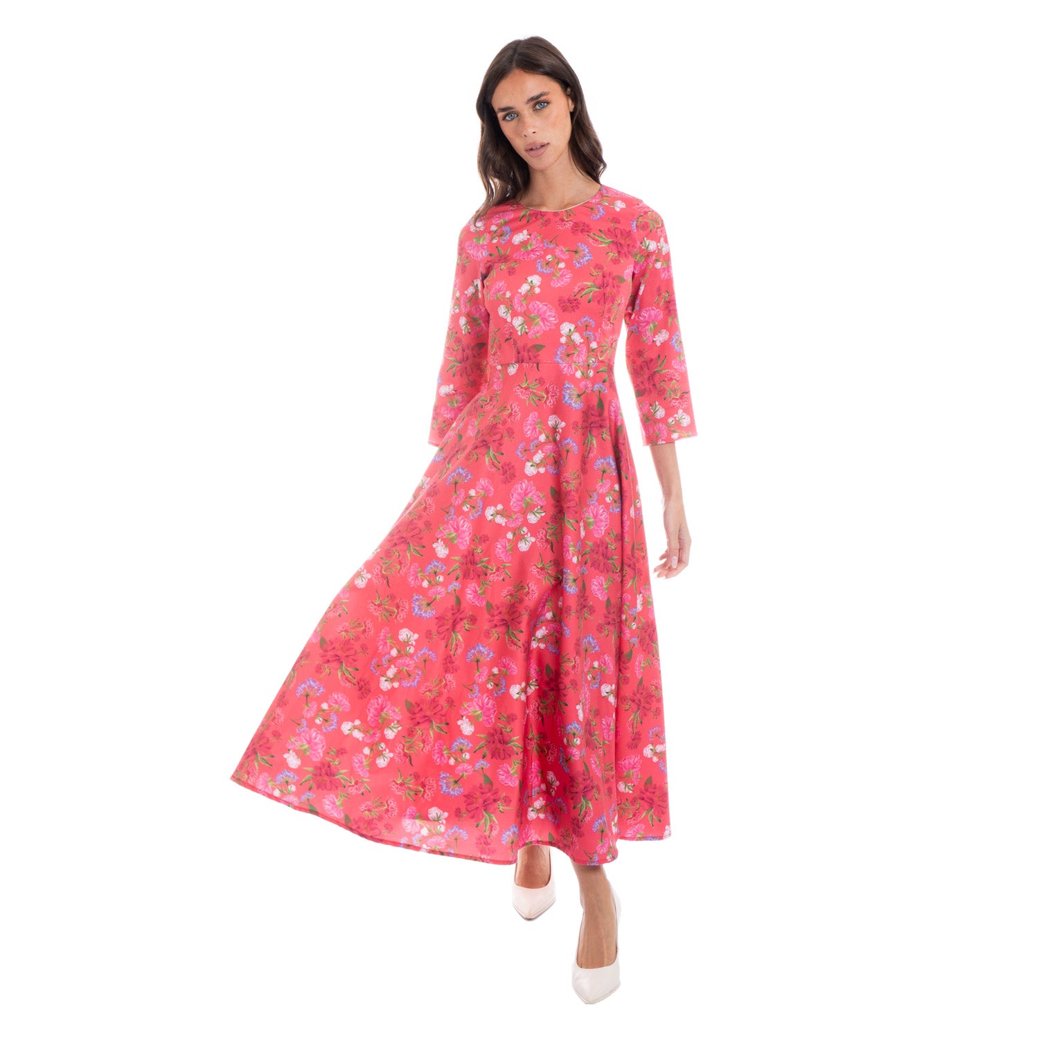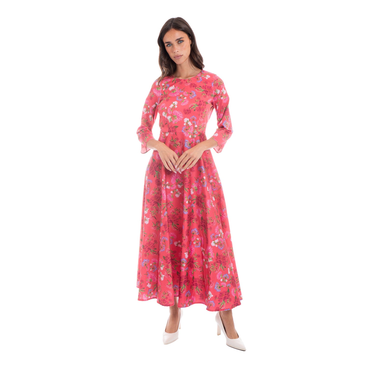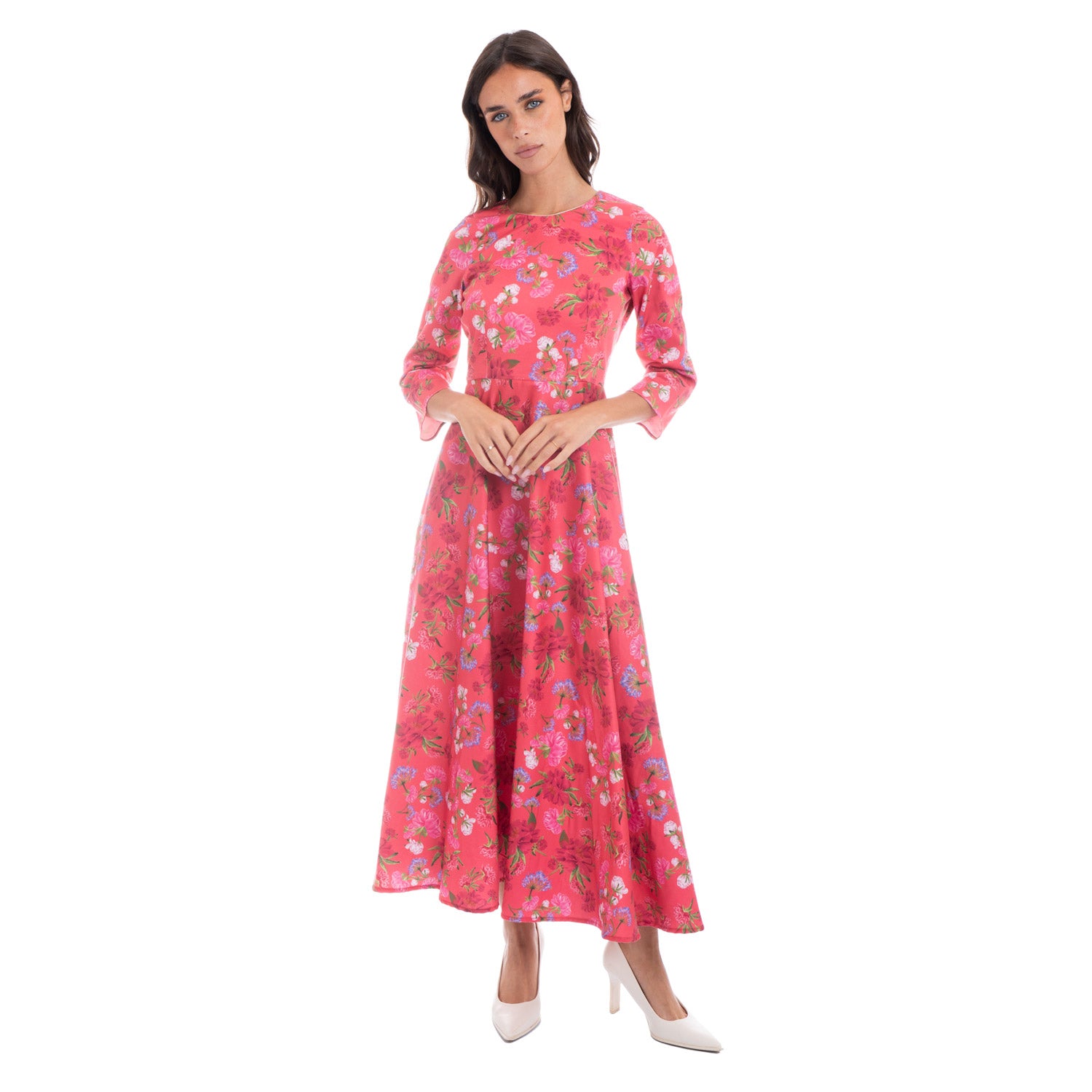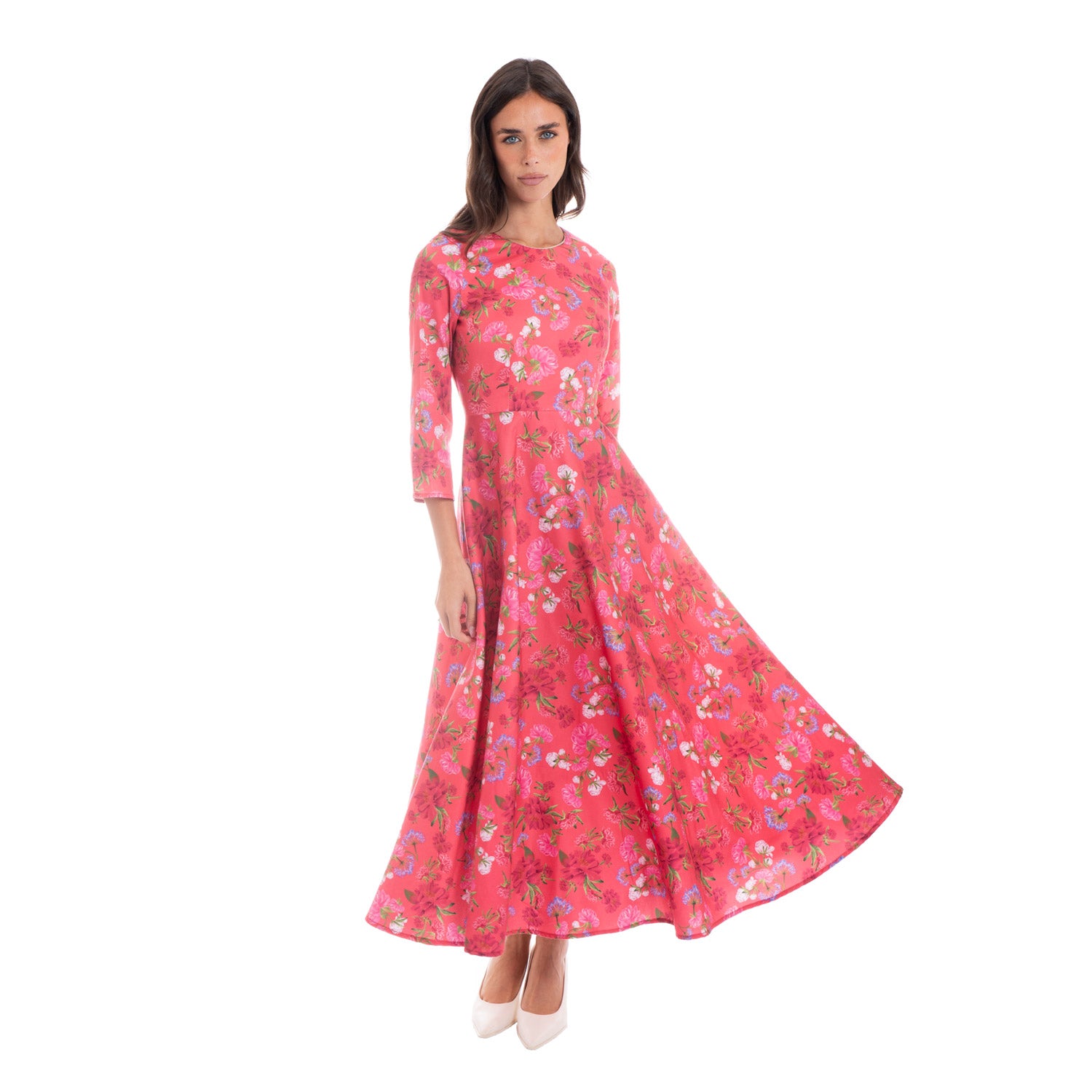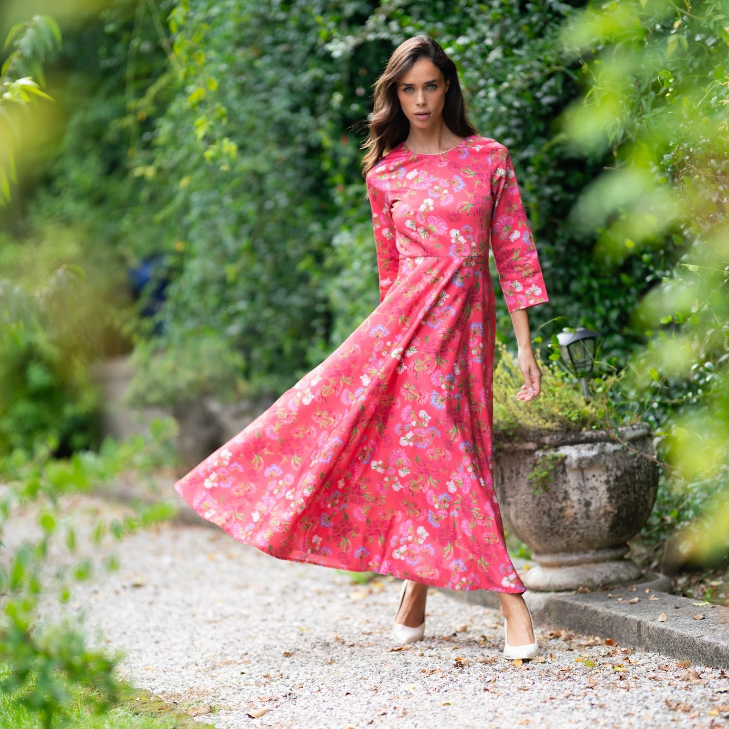 This exquisite handcrafted Floral Garnet Gown embodies a timeless design, showcasing delicate Sofia Tsereteli’s unique floral print on luxurious Italian satin cotton. The gown features a classic silhouette enhanced with a delicate round neckline, an alluring open back secured by a hidden zip and hand-covered button.
