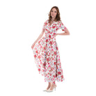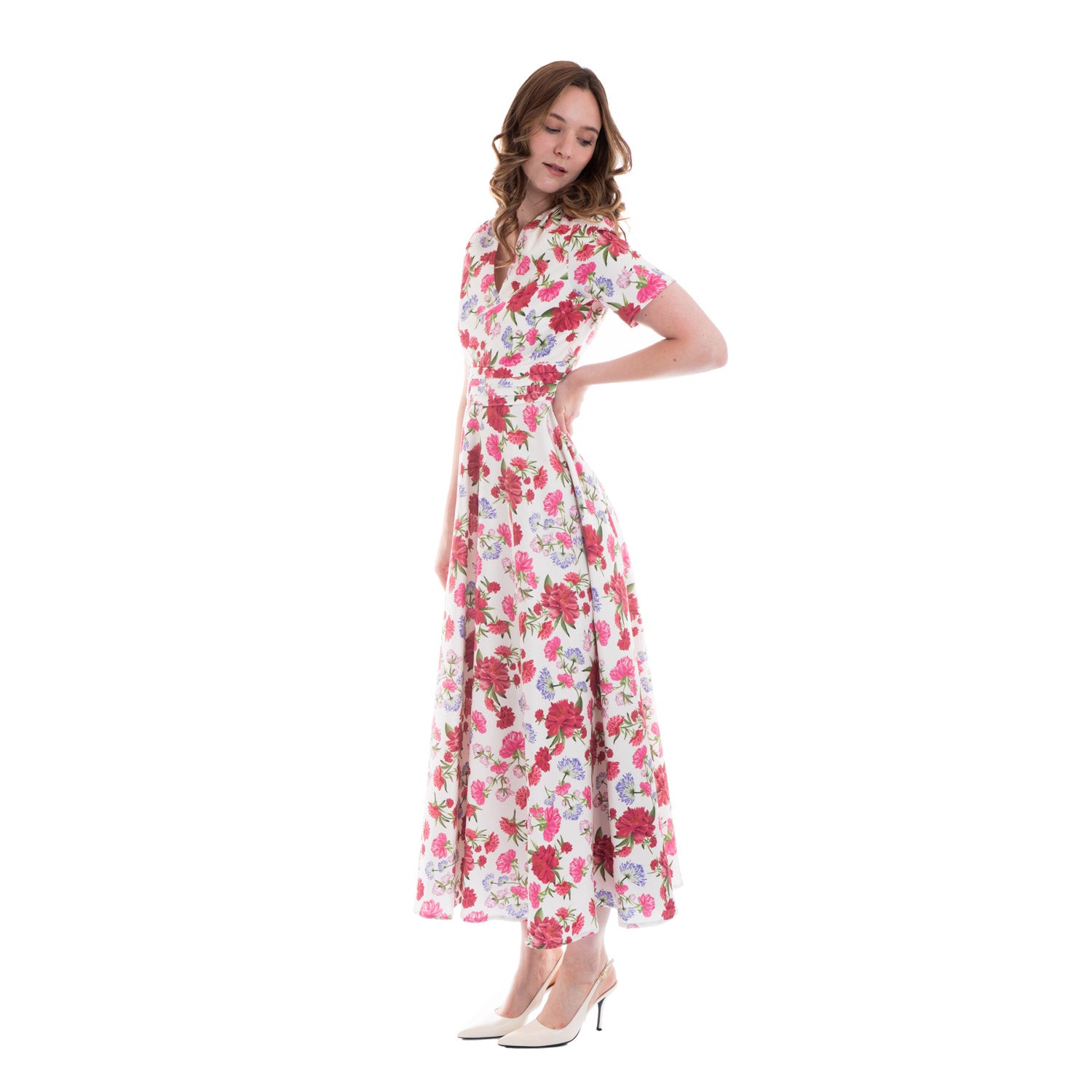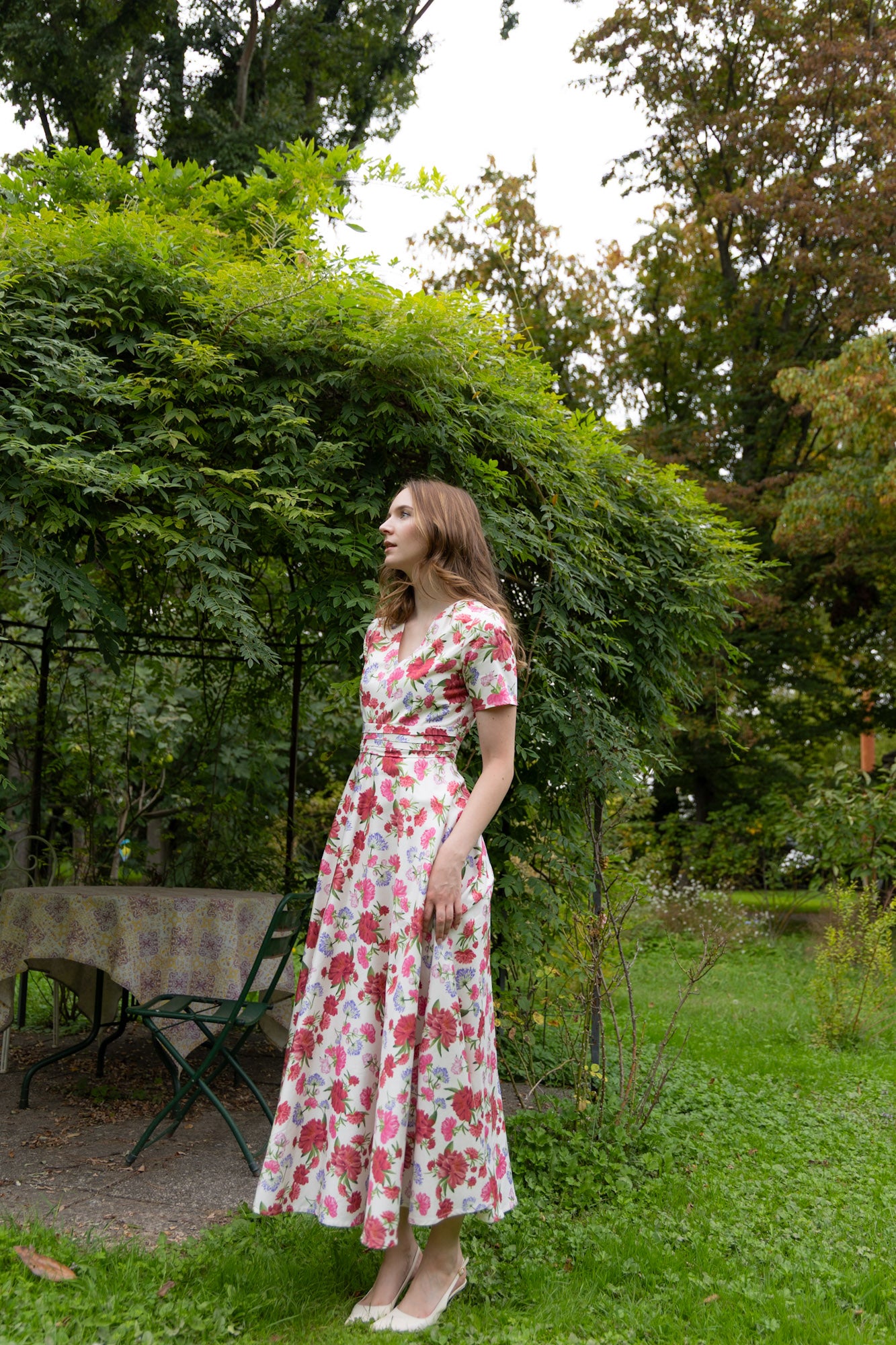 This exquisite gown is a romantic masterpiece, capturing the essence of feminine elegance and enchanting grace. Handmade with the utmost care and artistry in Italian satin cotton, painted with exquisite Sofia Tsereteli’s signature floral print. Exquisite V- neckline, a timeless symbol of femininity. The hand-draped waistband sits elegantly at the waist. The half-circle skirt of the gown cascades with ethereal beauty, gracefully draping and embracing your every movement. To ensure the utmost comfort and luxury, the bodice is lined in Italian natural cotton, caressing your skin with sumptuous softness. The central back closure, adorned with hand-covered button, adds a touch of sophistication and elegance to the gown.