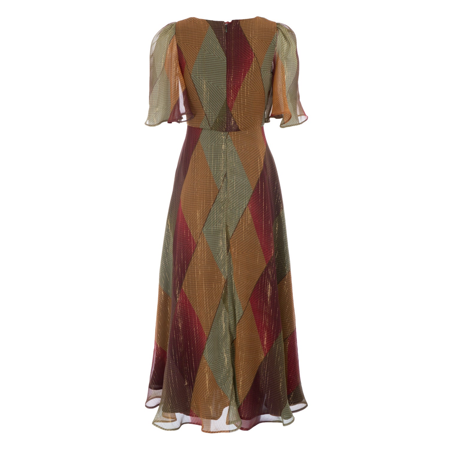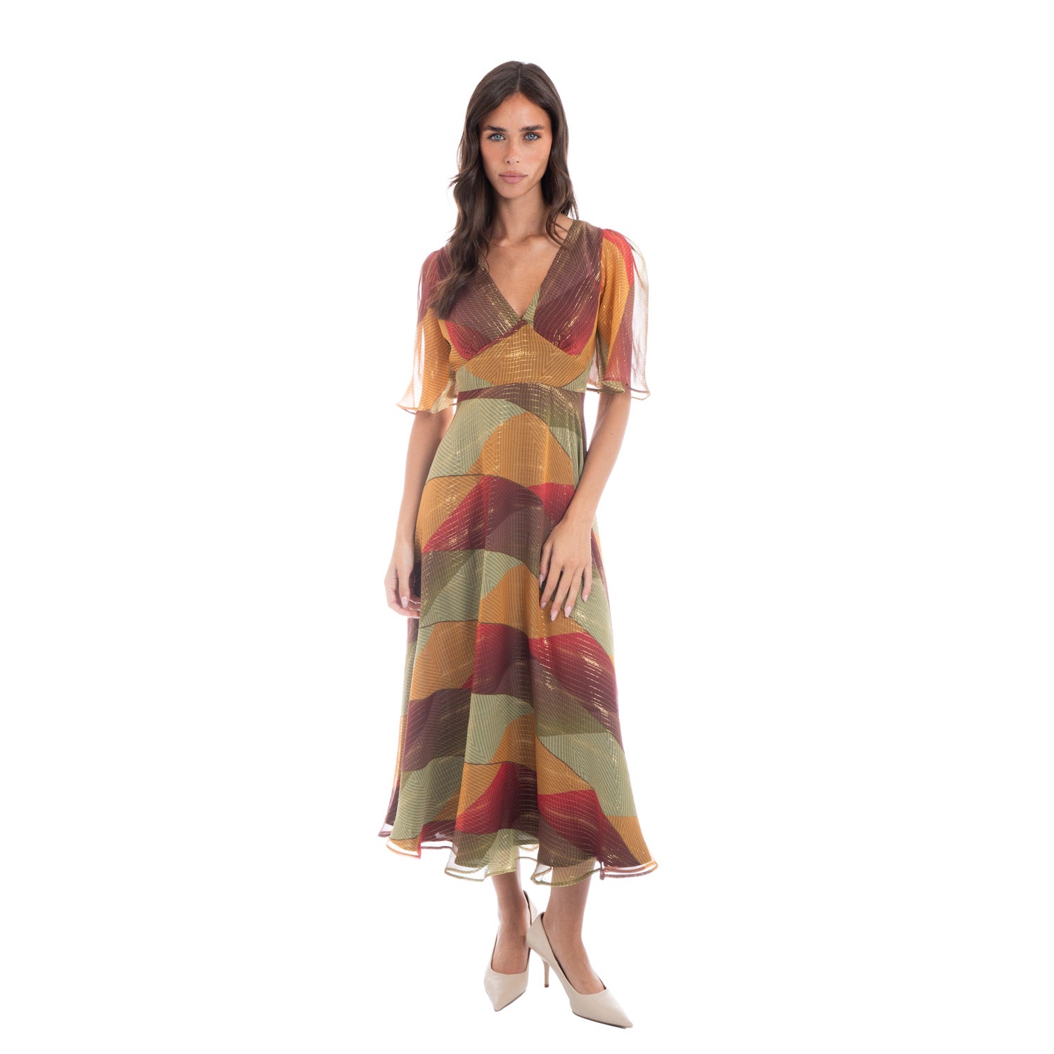 The feminine silhouette features flared sleeves, a V-neckline, and fitted bodice tailored to highlight the waist. The half circle skirt sways with your every step. The dress is fully lined  in natural silk fabric.