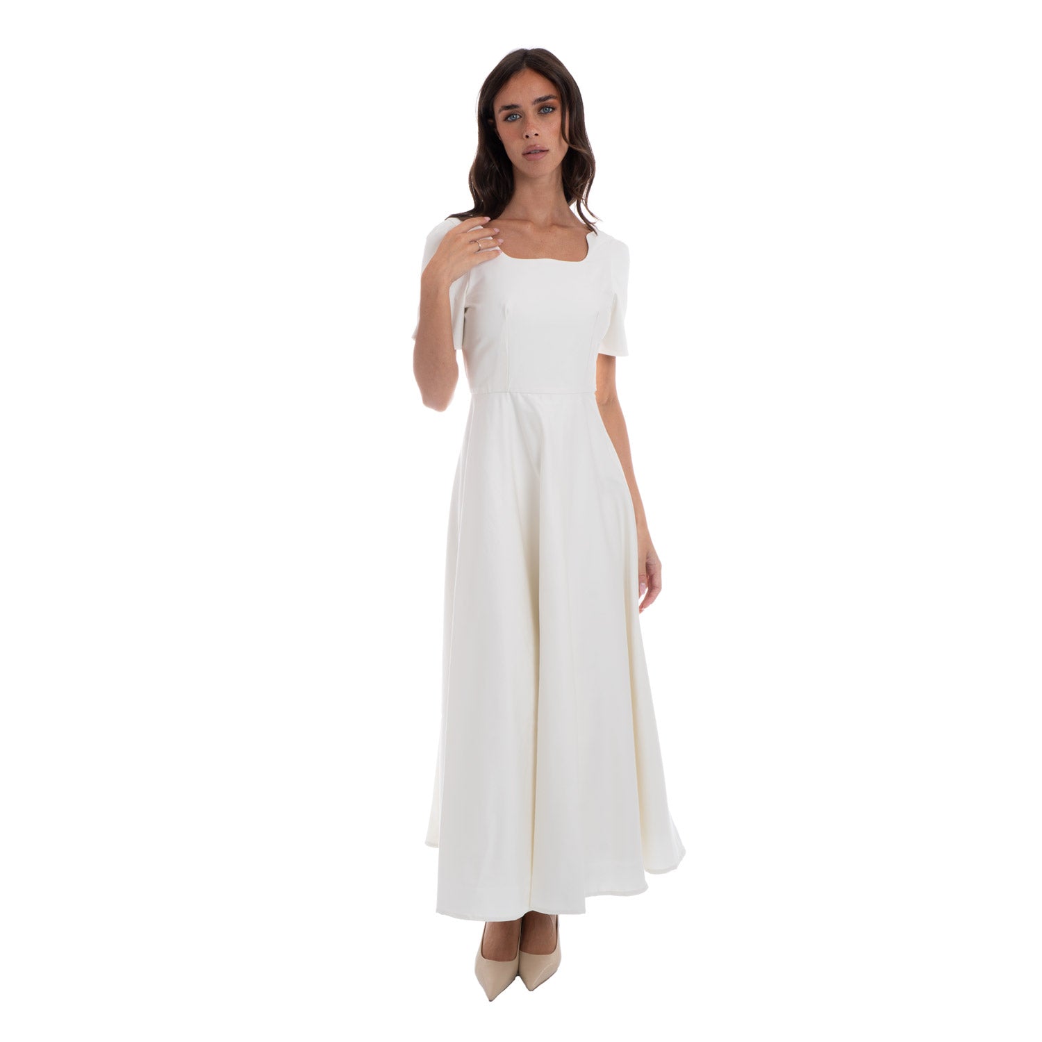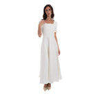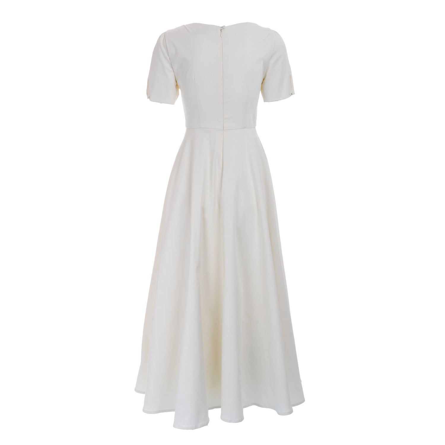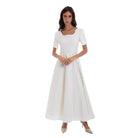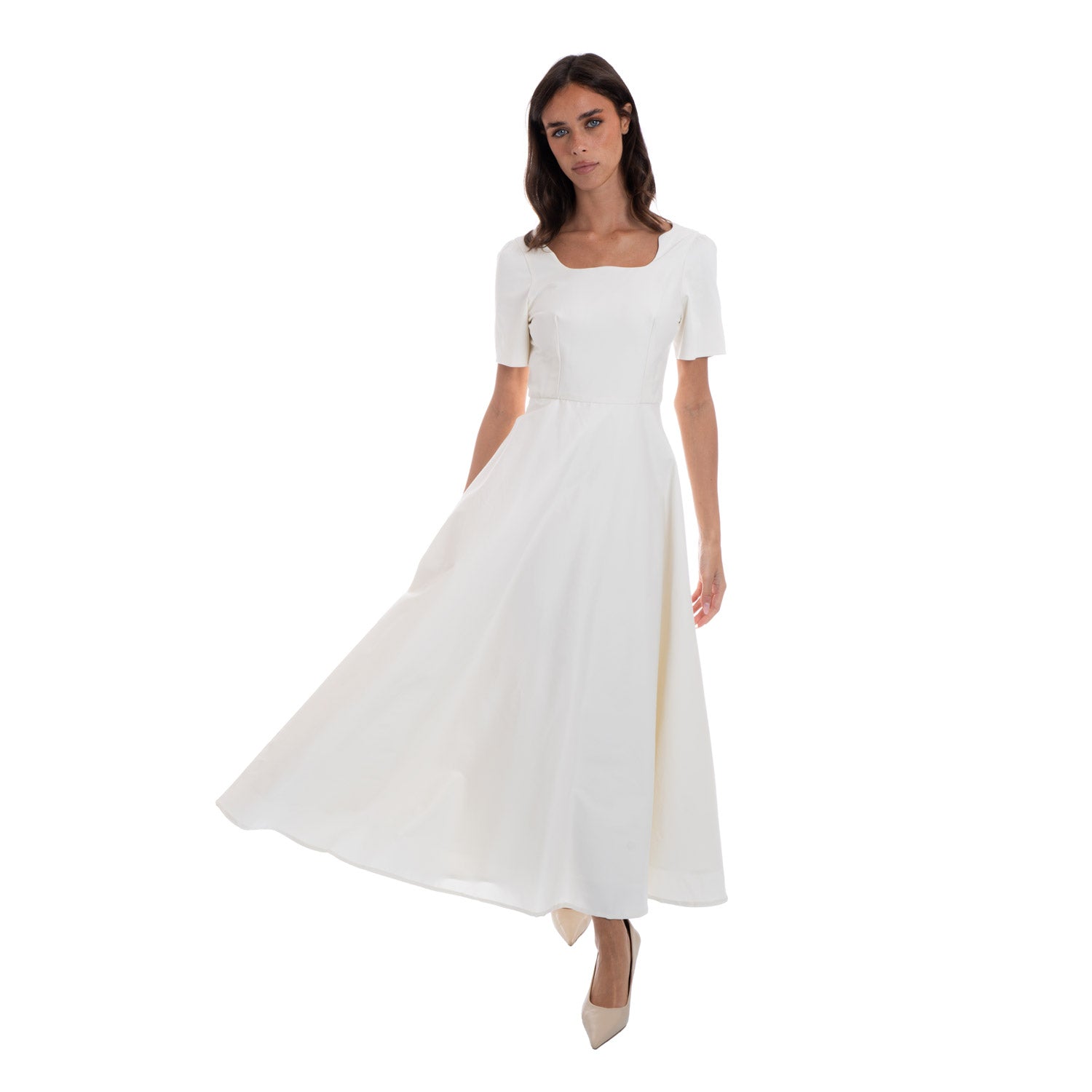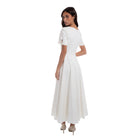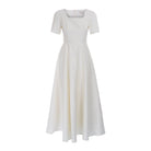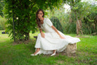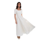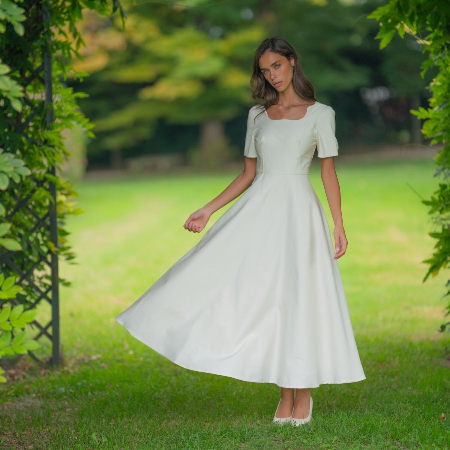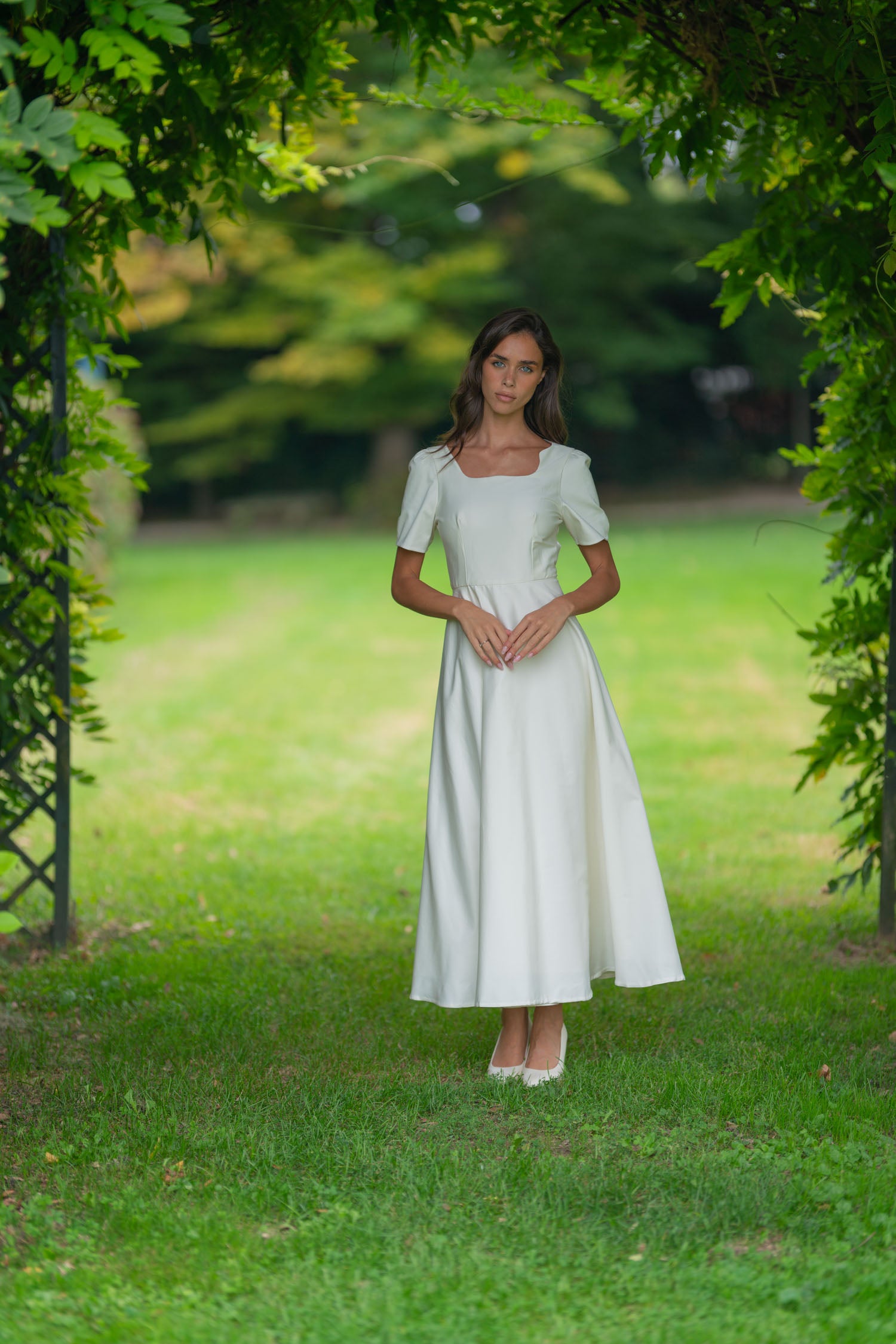 Romantic short sleeves gently open with meticulously hand-covered buttons, central back closure, adorned with delicate hand-covered button infuses the gown with an extra touch of sophistication and refinement. The half-circle, hand-hemmed skirt flows gracefully, offering an effortless elegance that makes this gown an unforgettable choice for your most special moments.
