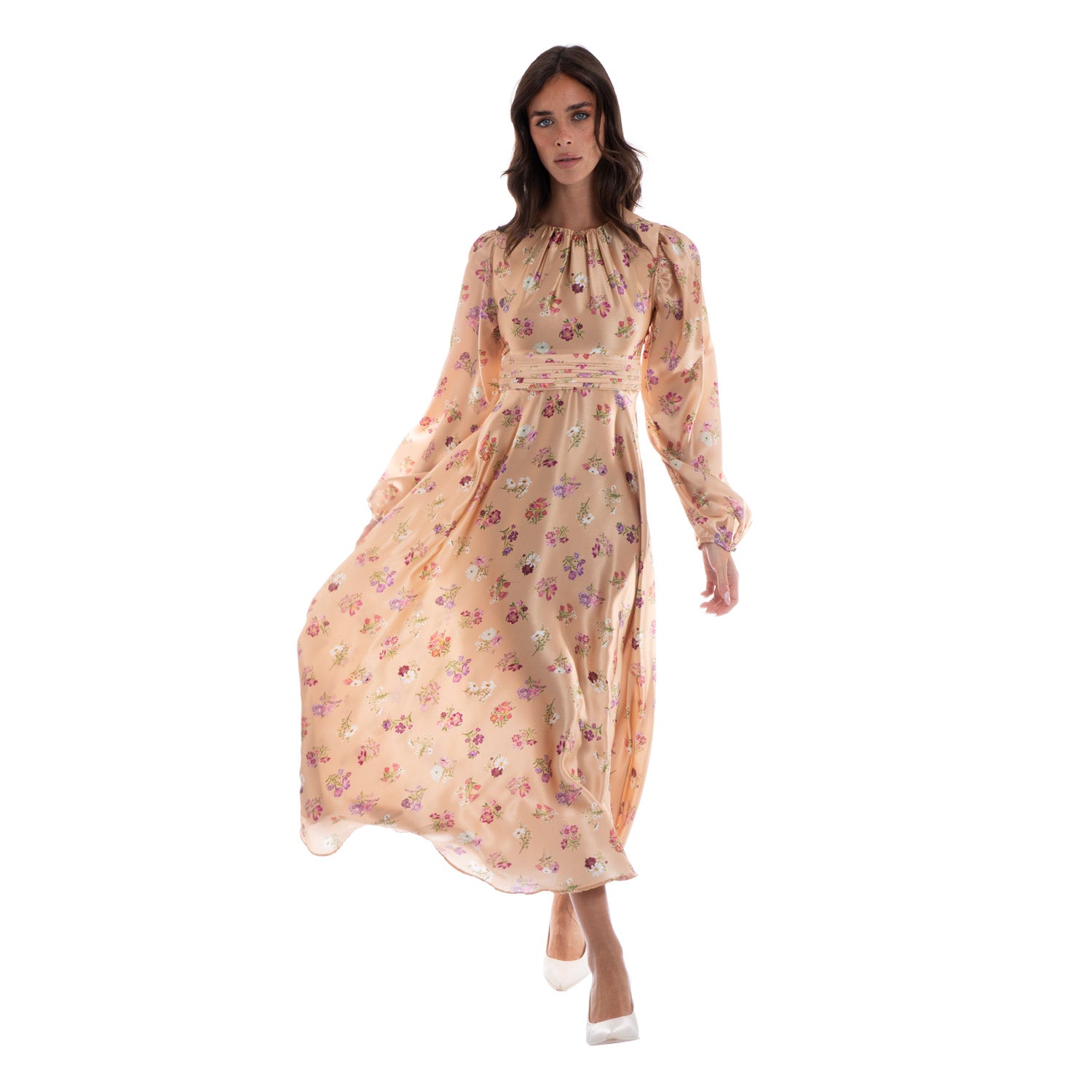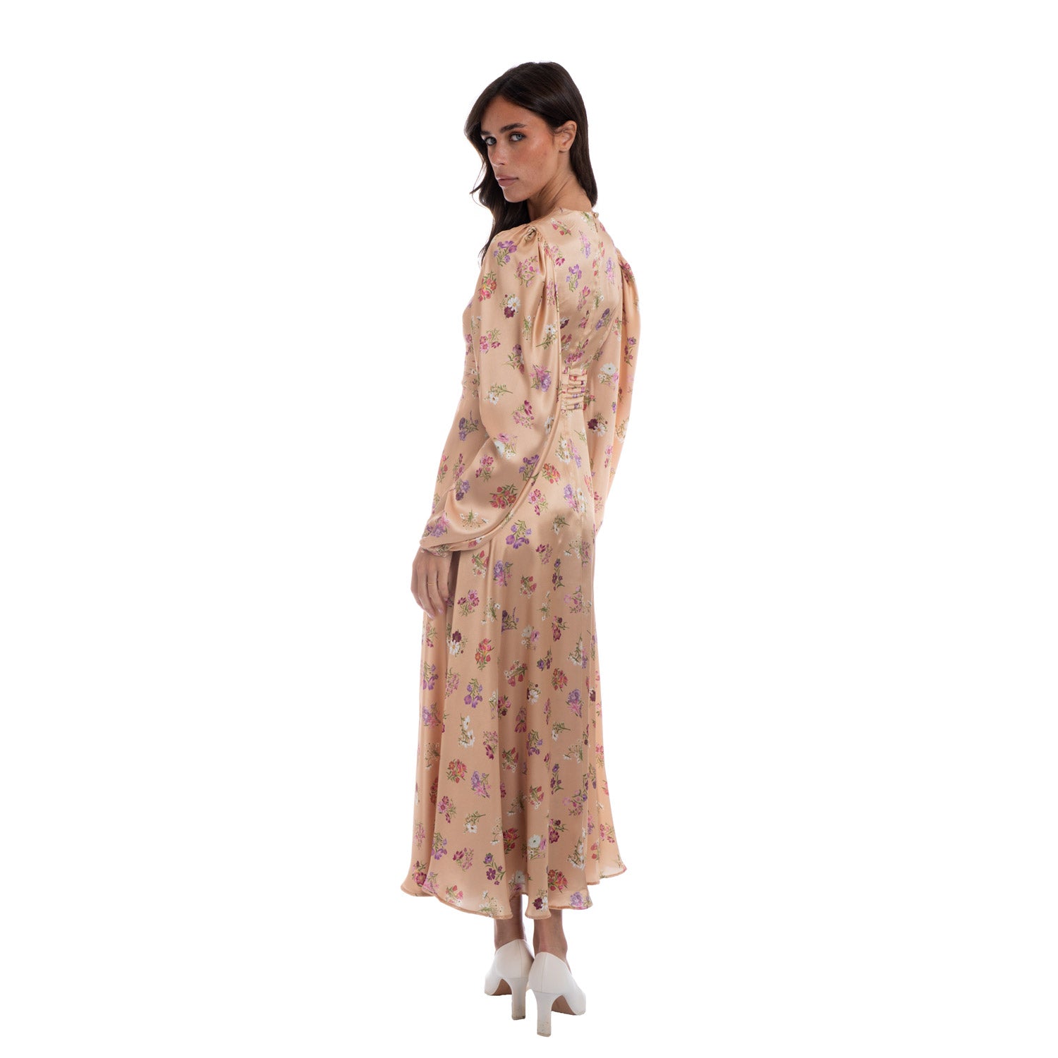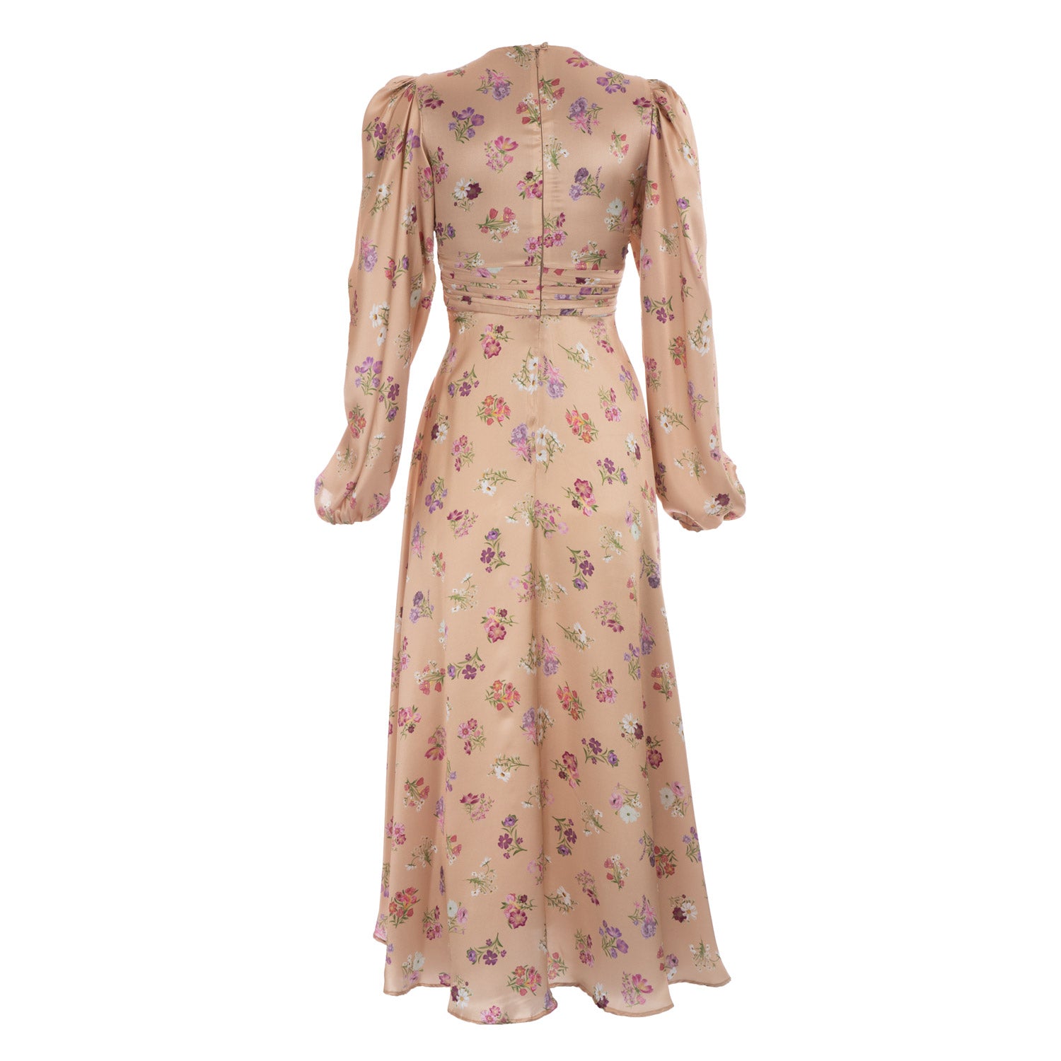 The Royal Sunset gowns print features exquisitely delicate florals glowing softly against a backdrop of rich gold silk satin. This stunning contrast captures the elegance of dusk, where nature’s finest details are illuminated by the warm, fading light.