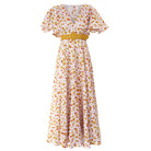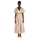 This elegant dress is crafted in a delicate floral linen print exclusive to Sofia Tsereteli. The feminine silhouette features full flared sleeves, a V-neckline, and fitted bodice tailored to highlight the waist. The full circle skirt sways with your every step. The bodice is lined in cotton for maximum comfort and to guarantee coolness on hot summer days. The final look is elevated with a coordinated yellow linen belt handmade by local artisan women in Sofia Tsereteli fabrics.