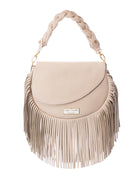 This beautiful ‘MOONSTONE’ bag is an exclusive design by Sofia Tsereteli.  Handmade to order just for you in an exceptionally soft cream-colored deerskin.  The design features beautiful double fringing and is embellished with a gold-finish metal label.  Your bag can be hand-held with a soft hand-woven deerskin leather plait with concealed seams or you can use the soft deerskin shoulder strap.  Both straps are removable with small carabiners. The bag has double opening with a zip for easy access.