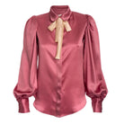 Soft-line tailored blouse with concealed buttoning in the center front, rear yoke with central placket. Pleated sleeve with gathered hem and cuffs that can be closed by two hand-covered buttons. A delicate sail collar and applied inside a removable ivory silk bow. Combinable with all our skirts. Ideal for any occasion.