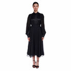 Soft-line tailored blouse with concealed buttoning in the center front, rear yoke with central placket. Wide sleeves with gathered hem and cuffs that can be closed by two hand-covered buttons. A delicate sail neck. Combinable with all our skirts. Ideal for any occasion.